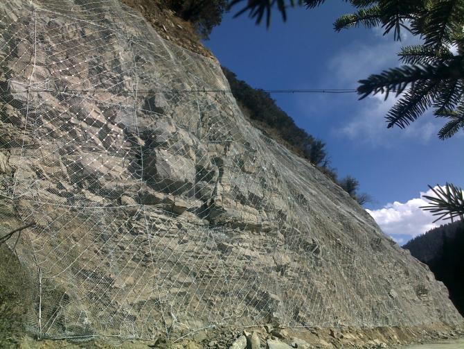 邊坡防護網(wǎng)分為主動(dòng)防護網(wǎng)和被動(dòng)防護網(wǎng),主動(dòng)防護網(wǎng)就像是用發(fā)泡聚苯乙烯把梨整個(gè)包起來(lái)一樣,但是主動(dòng)防護網(wǎng)主要用鋼絲繩網(wǎng)為主的各類(lèi)柔性網(wǎng)覆蓋或包裹在需防護的斜坡或巖石上,降低坡面巖石因為風(fēng)化墜落或者滑坡等災害造成的損害。被動(dòng)防護網(wǎng)是由鋼絲繩網(wǎng)、高強度鐵絲格柵網(wǎng)、錨桿、工字鋼柱、上下拉錨繩、消能環(huán)、底座及上下支撐繩等部件構成。對防護區域的坡面進(jìn)行防護。當主-被動(dòng)防護系統覆蓋于爆破開(kāi)挖工作面上時(shí),便形成了防止爆破飛石危害的柔性安全防護系統。