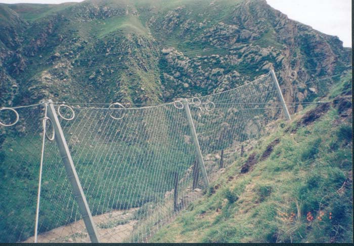 適用于建筑設施旁有緩沖地帶的高山峻嶺,把巖崩、飛石、雪崩、泥石流攔截在建筑設施之外,避開(kāi)災害對建筑設施的毀壞 的常用規格:[鋼柱(間距10M),帶消能環(huán)的∮16雙支撐繩和∮16“人”字形上拉錨繩(每跨6個(gè)消能環(huán)),∮16側拉錨繩(單繩),◇/08/200/4*5㎡鋼絲繩網(wǎng),∮8縫合繩,格柵網(wǎng)]